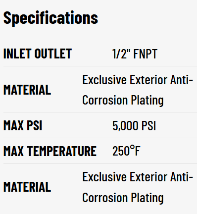 Inlet and Outlet: Features 1/2" FNPT connections on both ends, allowing for a universal fit with standard high-pressure hoses and fittings.