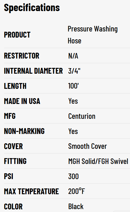 The Centurion 100' Contractor Hose (Part #7486) is a contractor-grade water transfer hose built for dependable tank filling and daily jobsite use. With a 300 PSI rating, 3/4" ID for strong flow, and a smooth non-marking jacket, it’s designed to move water efficiently while handling the real-world abuse hoses take around trucks, trailers, and wash setups. Standard garden-hose connections—FGH inlet and MGH outlet—make it easy to integrate into common fill and supply configurations without extra adapters.